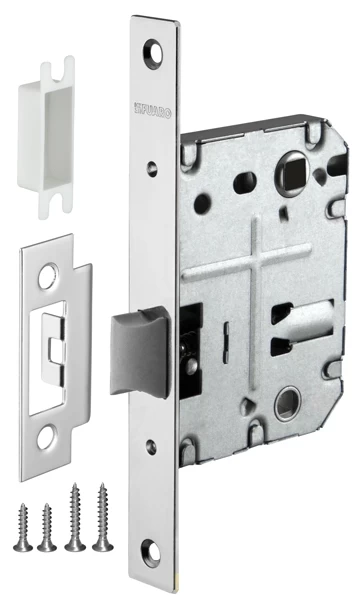 Дверная защелка с пластиковым механизмом Fuaro P72 серии PLASTIC изготовлена в соответствии с требованиями ГОСТ 5089-2003. Предназначена для установки в деревянные межкомнатные двери. Легкая смена направления язычка защелки, подходит для дверей левого и правого открывания. Корпус выполнен из стали с надежным гальваническим покрытием. Ударопрочный пластиковый механизм обеспечивает бесшумность работы защелки. Защелка P72 с усиленным блоком пружин имеет высший 4 класс надежности (250 000 циклов открывания/закрывания). Отверстия под стяжные винты находятся на расстоянии 35-41 мм. Размер бэксета - 50 мм. Размер межосевого расстояния - 70 мм. Возможна установка дверных ручек на стяжные винты для более прочного крепления. Цвет: хром. В комплектацию входят: ответная планка с декоративной вставкой и крепежная фурнитура в цвет изделия.